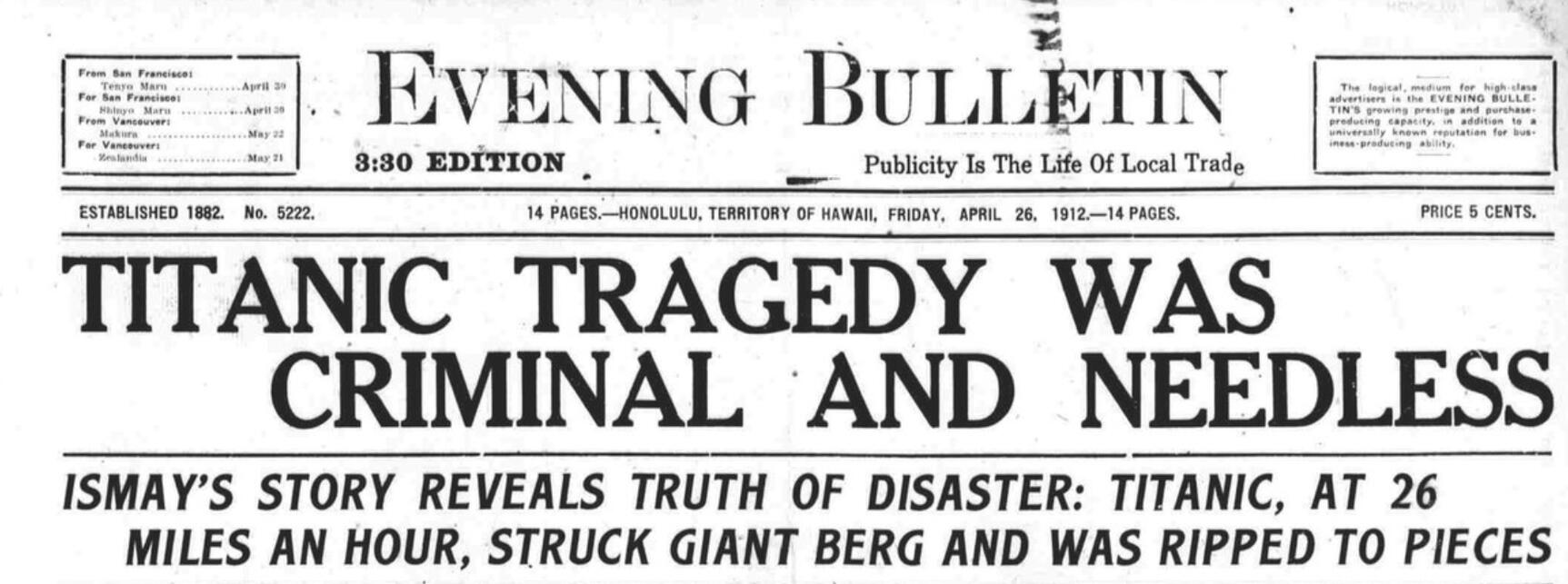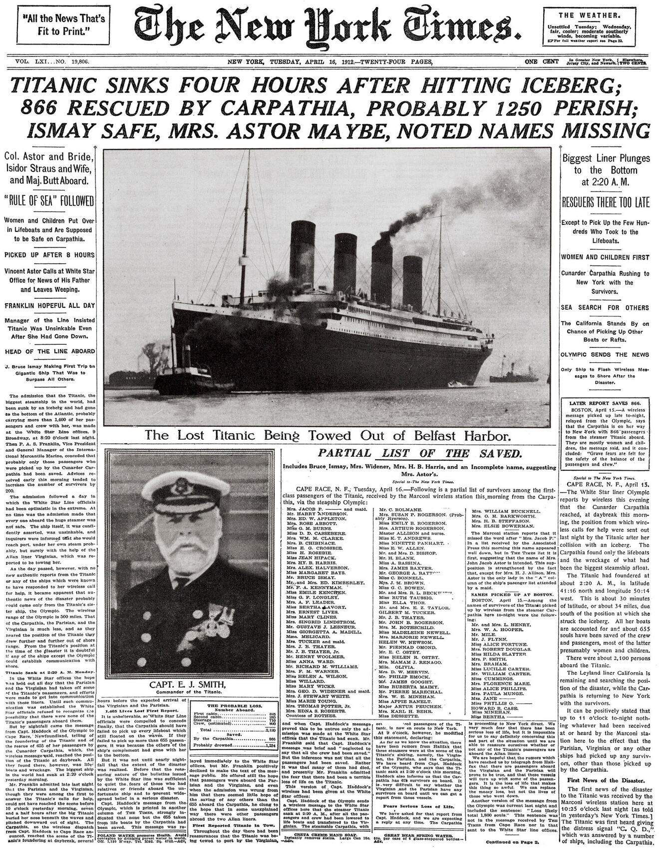 April 14, 1912: The RMS Titanic of the White Star Line strikes an iceberg in the North Atlantic.