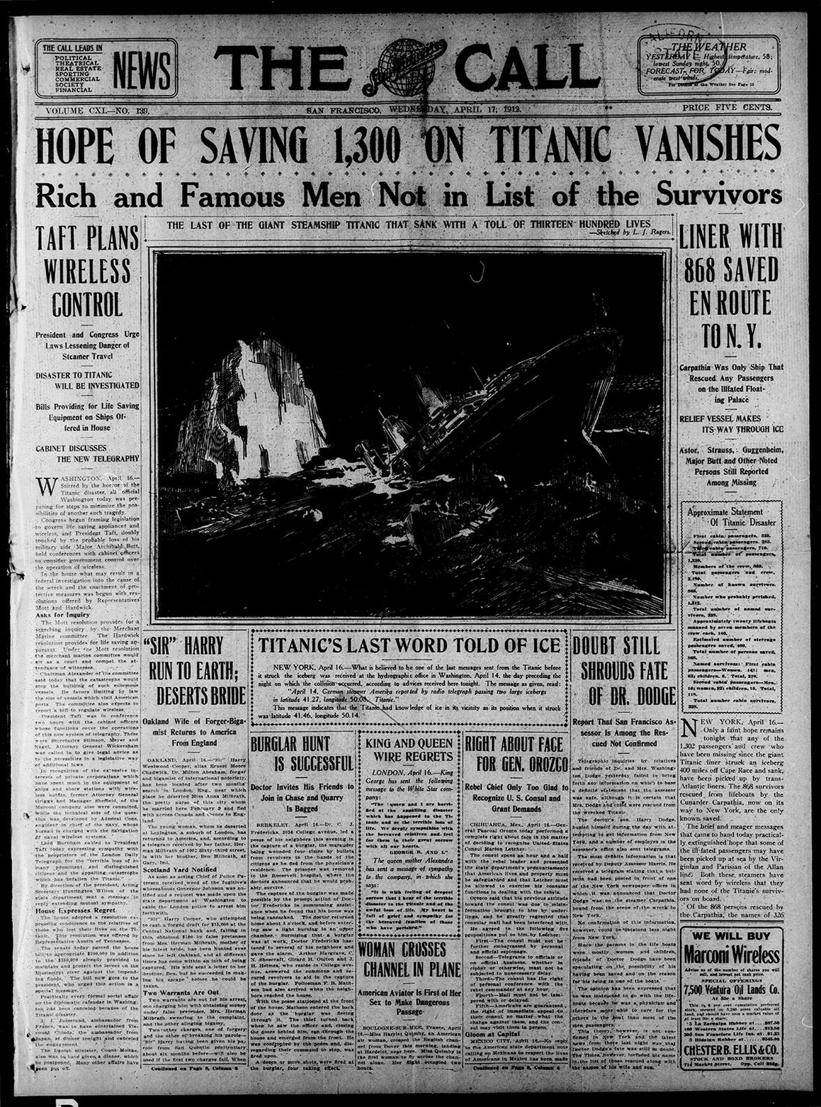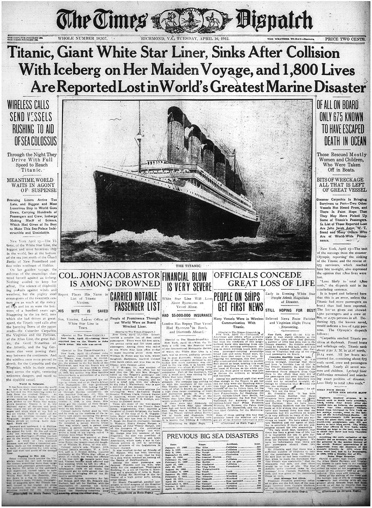 April 14, 1912: The RMS Titanic of the White Star Line strikes an iceberg in the North Atlantic.